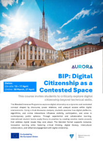 This Blended Intensive Programme explores digital citizenship as a dynamic and contested concept shaped by discourse, power relations, and unequal access within digital environments. Using critical discourse analysis, students examine how digital platforms, algorithms, and online interactions influence visibility, participation, and voice in contemporary public spheres. Through experiential and collaborative learning, international student teams apply theory to practice by creating creative media projects that address digital issues they care about. The blended format supports inclusive, innovative learning while fostering critical thinking, digital literacy, intercultural collaboration, and reflective engagement with digital citizenship.