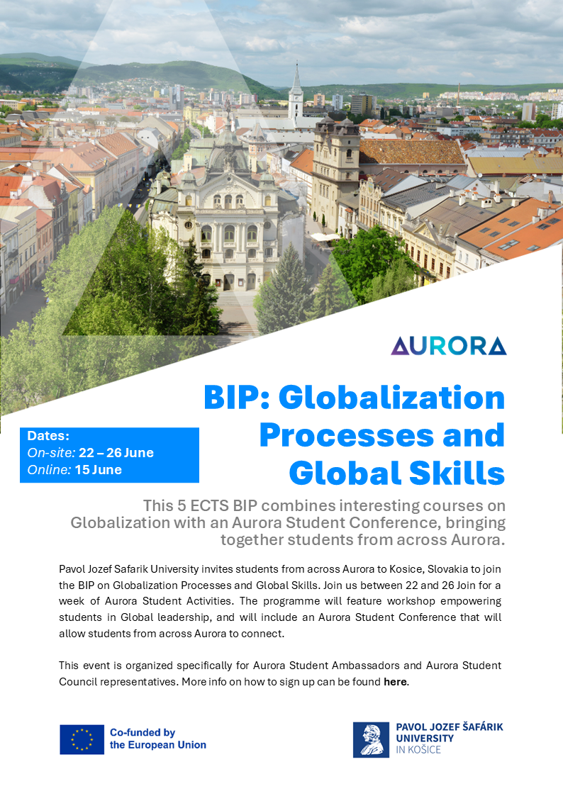 Pavol Jozef Šafárik University invites students from across Aurora to Košice, Slovakia to join the BIP on Globalization Processes and Global Skills. Join us between 22 and 26 June for a week of Aurora Student Activities.