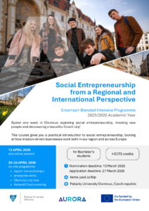 This course gives you a practical introduction to social entrepreneurship, looking at how mission-driven businesses work both in our region and across Europe. Organized by the Department of Economic and Managerial Studies at Palacký University Olomouc, it is structured as a blended experience: one online session to set the scene, followed by a five-day intensive on-site programme in Olomouc.During the on-site week, you will join expert-led lectures, guided group discussions and field visits to real social enterprises – so you can see how social impact is created in practice and what it takes to run a mission-driven organisation day to day, from business model and funding to management and growth.