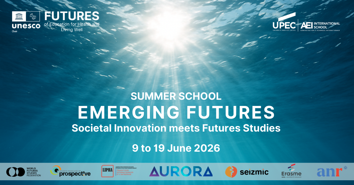 From 9 to 19 June 2026, Université Paris-Est Créteil (UPEC) hosts the Aurora Summer School “Emerging Futures: Societal Innovation Meets Futures Studies” at the AEI International School, in collaboration with the UNESCO Chair on the Futures of Education for Health and Living Well.